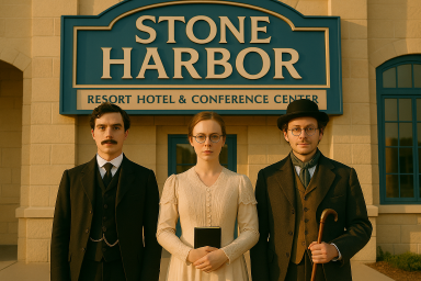 The day began not with scholarship but with song. Our delegation gathered at Rawley Point in the waning afternoon, carpooling northward in two overburdened wagons of dubious comfort. Eleanor Price, irrepressible, led the company in sea shanties the entire drive, while Whitcomb attempted counter-harmonies that strained both voice and patience. We paused briefly at the tower of the Door County Maritime Museum, where the bay below shone copper in the declining light. It was a rare moment of quiet reverence—long shadows stretched across the water, the air still warm yet edged with autumn’s crisp intent.