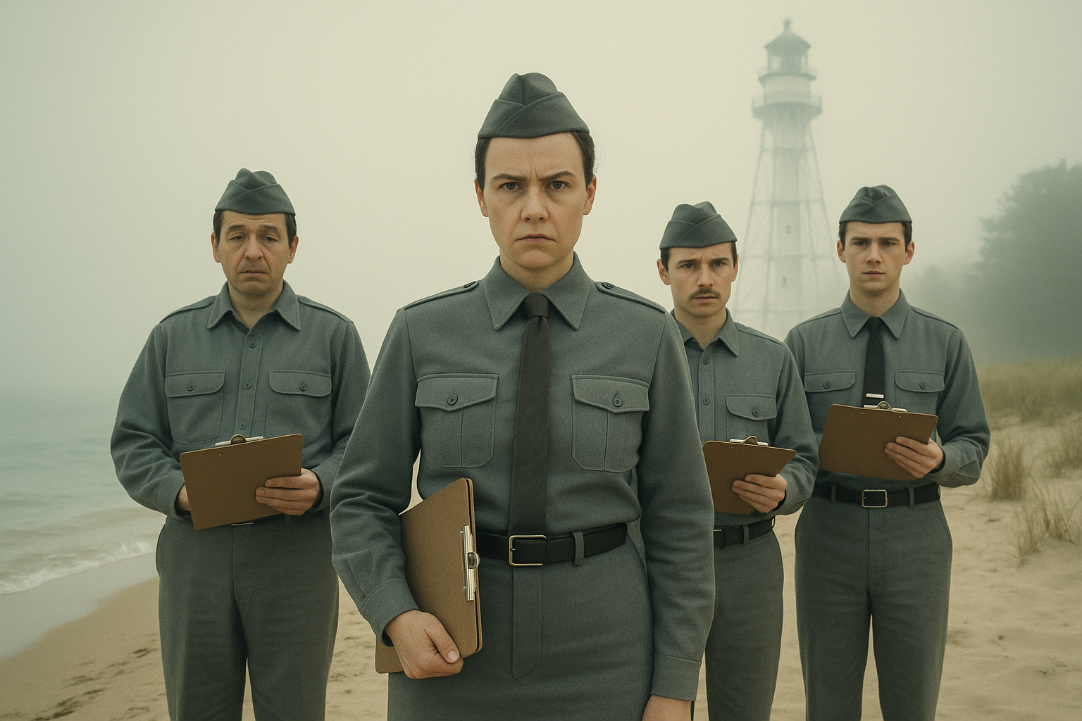 At that precise moment, a rising bank of mist parted to reveal the GLRC—Great Lakes Research Commission—advancing in uncanny formation. They came in matching uniforms of storm-gray, hems crisp as rulebooks, their clipboards raised like bayonets. Not one coughed, not one glanced aside; even their shoelaces seemed regulated by statute. At their head strode the Commission’s leader, eyes narrowed like a surveyor’s theodolite, with a phalanx of deputies behind her, pens uncapped, ink cartridges gleaming like ordnance. They moved with the precision of tides scheduled by committee, a bureaucratic wave rolling inexorably toward us.